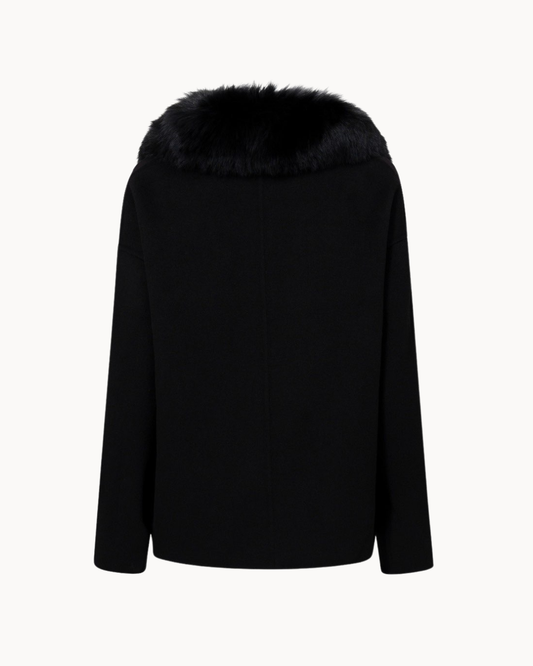 Doppelreihiger Wollmantel mit abnehmbarem Fellkragen - Schwarz