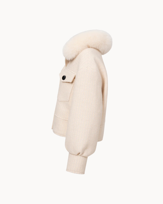 Kurz geschnittene Wolljacke mit Knopfleiste und abnehmbarem Fellkragen