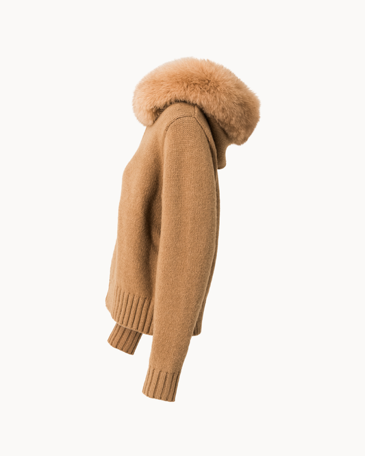 Strickjacke mit Reißverschluss, Kapuze und abnehmbarem Fellkragen