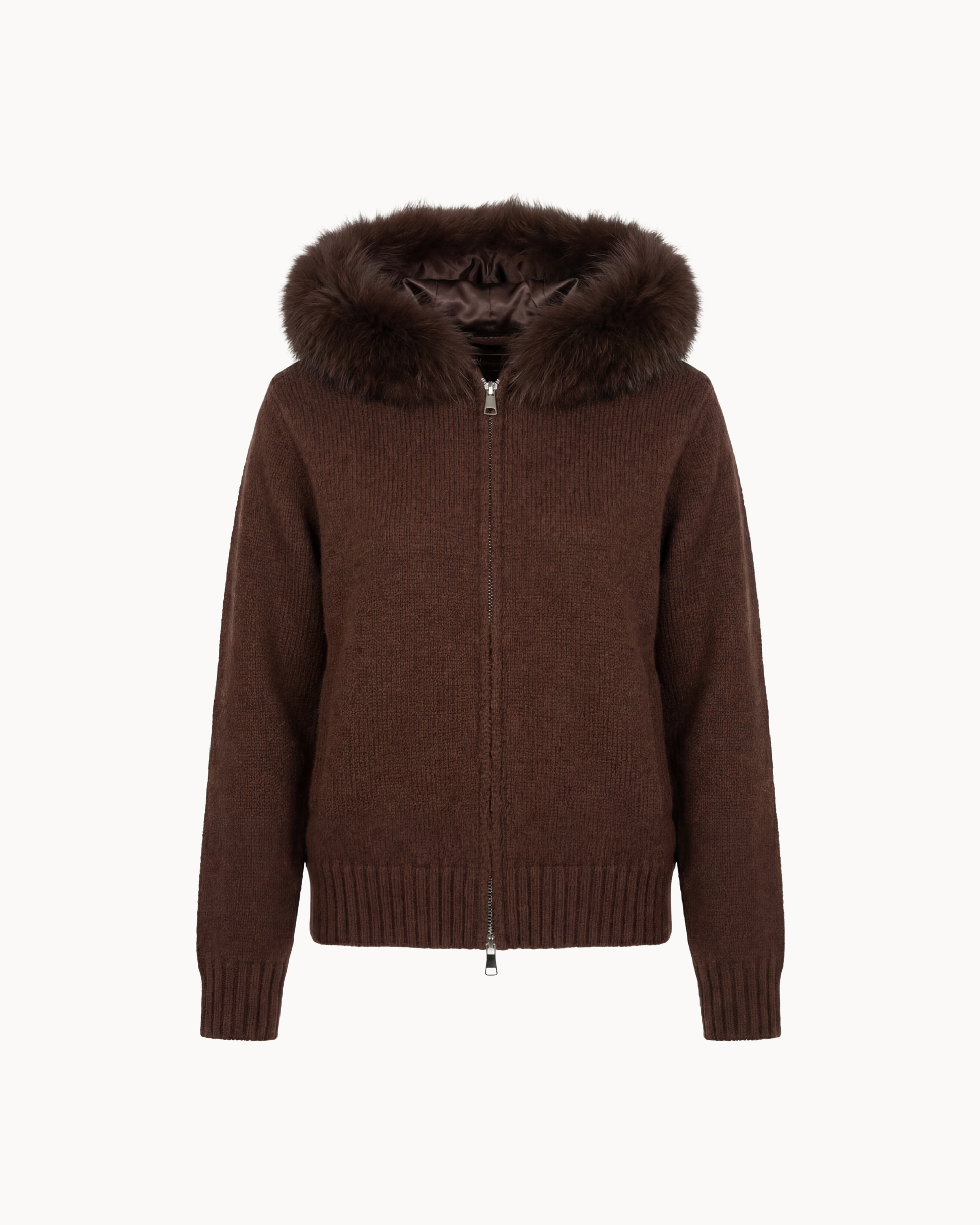 Langärmelige Jacke mit Kapuze und durchgehendem Reißverschluss auf der Vorderseite. Die Kapuze ist mit einem umlaufenden Besatz ausgestattet. Gerippte Abschlüsse an Saum und Ärmelenden sind vorhanden. Die Jacke ist hüftlang geschnitten und als Oberbekleidung vorgesehen.